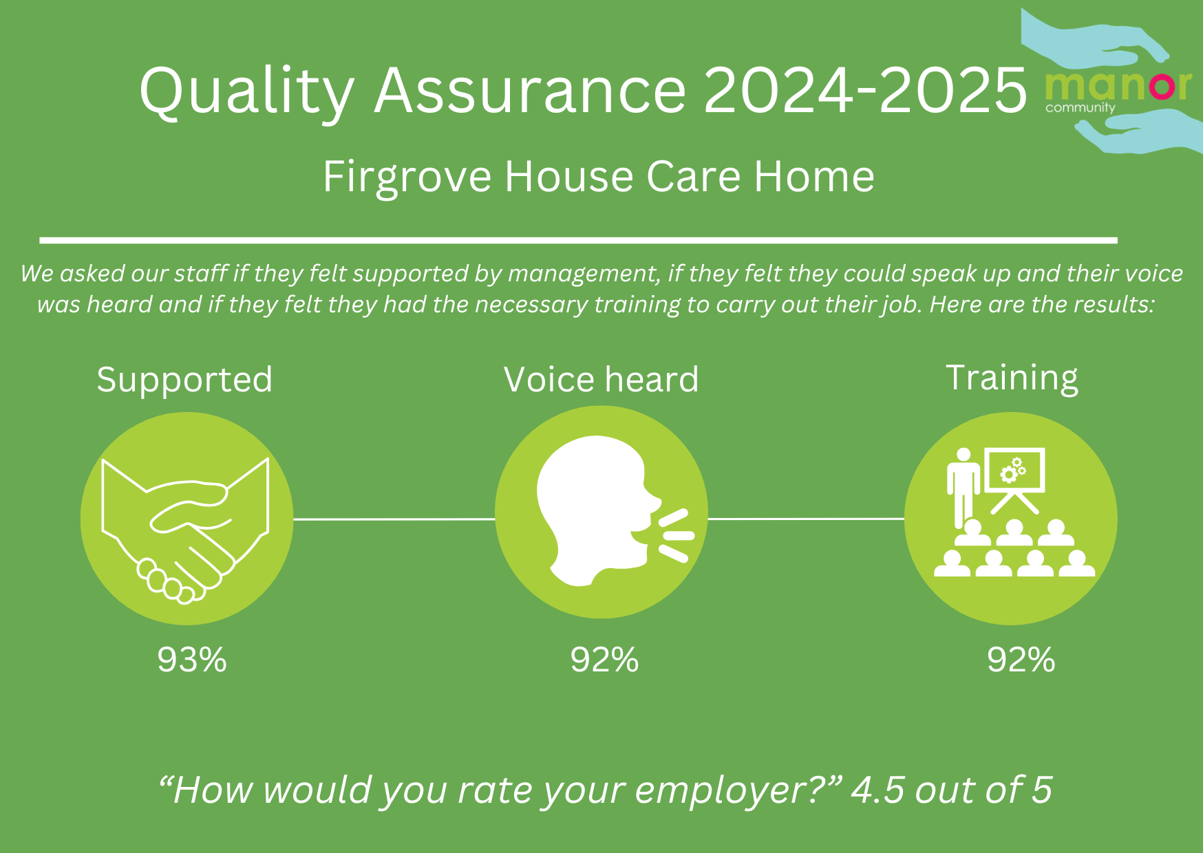 The Main House and The Coach House have Care Staff available 24 hours a day. The aim of all staff at Firgrove House, is to create a warm and friendly environment for all our clients, making it a happy place to live.